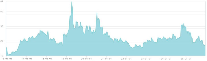 中证全指证券公司指数(399975.SZ)近十年PE-TTM走势